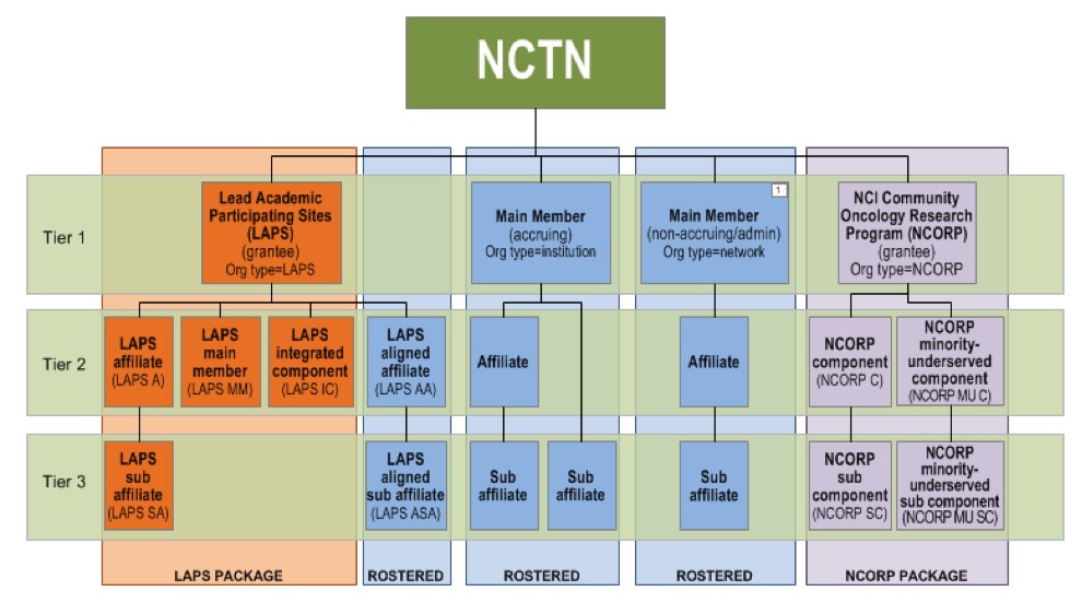 - Tier 1 members of Lead Academic Performance Site (LAPS) and NCI Community Oncology Research Program (NCORP) represent the administrative offices of the member network. Tier 1 of the Main member networks (non-LAPS, non-NCORP) can either be an administrative office of a health system (if approved by CTSU) or an accruing institution.