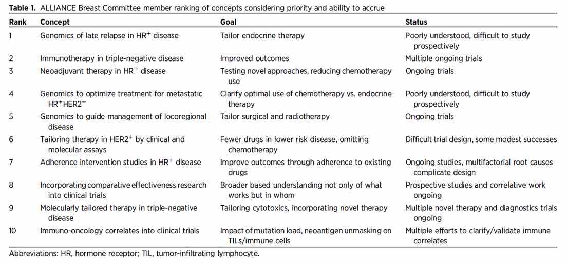In Fall 2016, we surveyed the Alliance Breast Committee membership regarding key clinical questions and feasibility of recruiting to trials addressing those questions. Fifty-seven responding committee members including both academic and community-based investigators as well as patient advocates chose from among 11 broad research areas identified by the breast committee leadership. The findings of this survey were analyzed descriptively and refined in order to identify the top-ranking concepts (Table 1 below). The gaps in knowledge identified by this survey illustrate the changing culture of breast cancer research, in which the multidisciplinary team has evolved to include scientists, public health researchers, and policy mavens in addition to patient advocates and clinicians. Through the survey results, the Alliance Breast Committee communicated that the group should prioritize testing not only drugs and regimens but also incorporate biologic and heal th services advances. Excellent outcomes and long disease-free intervals for many breast cancer subsets complicate design of trials addressing some of the unmet clinical needs. Late recurrence in hormone receptor-positive (HR+) breast cancer, for example, is an example of such a challenge.