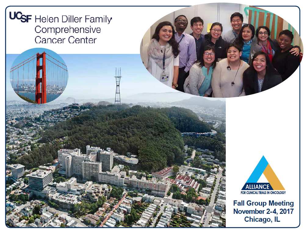 UCSF opened its Cancer Research Institute in 1948 in an effort to bring together clinical and basic research interests in the field. Following decades of seminal contributions to cancer research and treatment, it became an NCI-designated Comprehensive Cancer Center in 1999. The HDFCCC has been a longstanding Alliance (CALGB) member and currently spans five campuses in San Francisco with nine research affiliates in Northern California. HDFCCC investigators have served on and chaired several committees in the Alliance over the years, including Genitourinary, Gastrointestinal, Transplant, and Experimental Therapeutics and Rare Tumor. Highlighted on the cover is the Parnassus Campus which houses inpatient and outpatient research programs in hematopoietic malignancies, developmental therapeutics and cancer immunotherapy. In the cover photo are clinical research staff: First row (L to R): Lila Modarresi, Jeremy Burbanks-Ivey, Joey Chiang, Cynthia Yee, Andrew Chon, Lillian Diep, Charlie Aoun and Eseosa Igbinedion. Second row (L to R): Nancy Kang, Danielle Kilayko and Katrina Sadan.