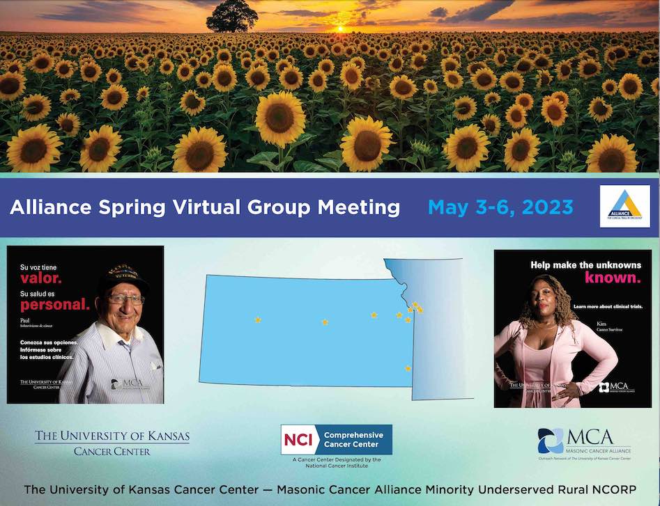 Congratulations to the University of Kansas Cancer Center – Masonic Cancer Alliance Minority Underserved Rural NCORP (KUCC-MCA) for the 2023 Alliance Spring Virtual Group Meeting Book cover design. Led by Priyanka Sharma, MD, and Gary Doolittle, MD, the KUCC-MCA NCORP aims to expand the reach of cancer clinical trials to rural communities in its Kansas and Missouri catchment area. The KUCC-MCA NCORP is comprised of 17 sub-affiliate sites throughout the Kansas City metropolitan area and rural Kansas. The meeting book is available on the Alliance member website. Click here.